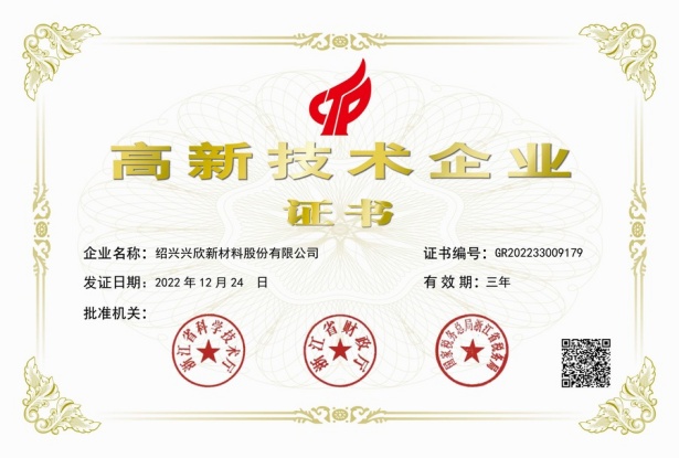 紹興興欣新材料股份有限公司成立于2002年06月27日,占地面積122畝,位于杭州灣上虞經濟技術開發(fā)區拓展路2號,現有職工200余人,專業技術人員50余人;博士、碩士研究生30余人組成的一支知識型、專業化的技術科研團隊。公司面向全球市場,專業開發(fā)電子化學品、環(huán)保化學品、醫藥中間體、高分子材料等先進新材料重點領域的省級科技型企業;建有浙江上虞、安徽東至兩個生產基地。目前為“國家高新技術企業”、浙江省“隱形冠軍”企業、浙江省專精特新中小企業;建有“省級”研究開發(fā)中心,共建天津大學浙江紹興研究院電子化學品研發(fā)中心。
